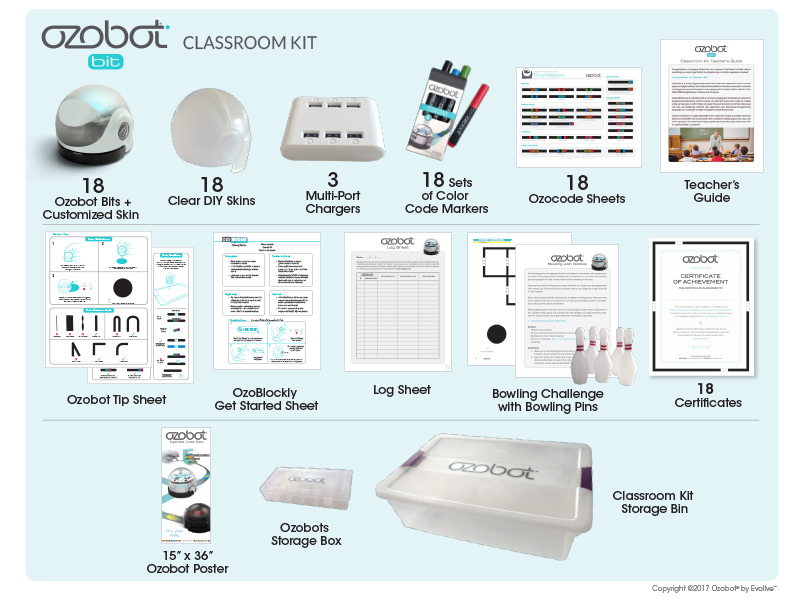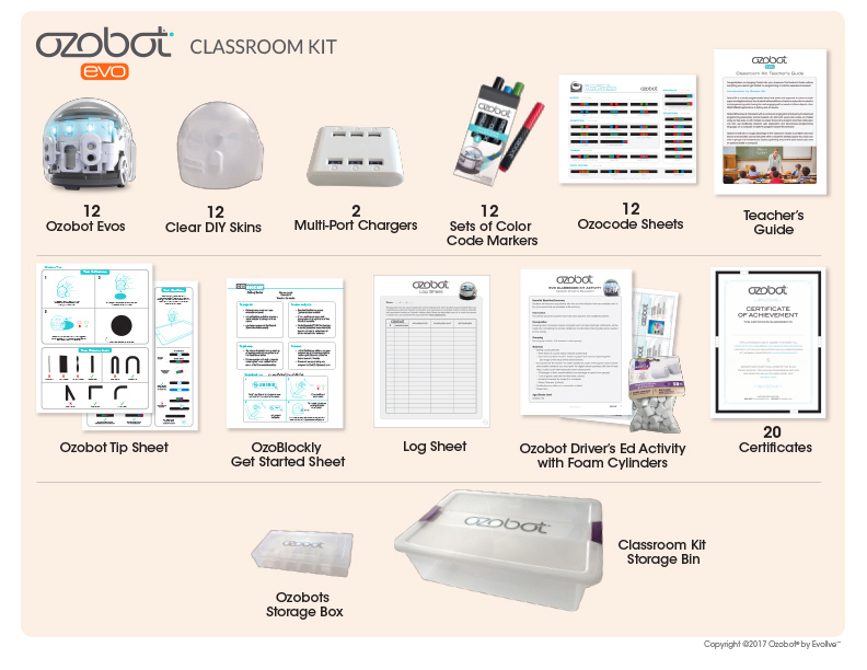 Ozobot Ozobot Evo Classroom Kit - Kit de sala de aula com 12 robôs Ozobot Evo - O Ozobot Evo Classroom Kit oferece aulas super interessantes. Inclui 12 robôs Evos, acessórios, atividades Ed Driver que ensina os alunos a programar os sensores de proximidade do Evo e outros recursos novos, e muito mais. O kit é uma maneira acessível e portátil para os educadores ensinar codificação, STEM, arte, história e outras matérias. O Ozobot é um pequeno robô inteligente que é programável através de linhas desenhadas e códigos de cores, e através do nosso editor OzoBlockly fácil de usar no qual você pode criar comportamentos autônomos e programas complexos. Seus alunos aprenderão robótica e programação com uma abordagem prática. O Ozobot torna o ensino STEM envolvente e suporta perfeitamente lições que vão desde matemática e ciência até arte e literatura.